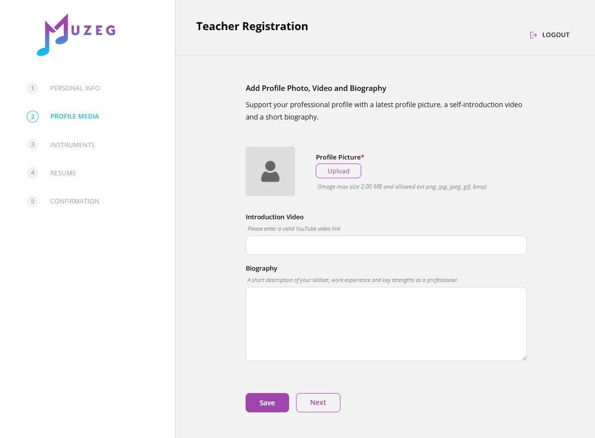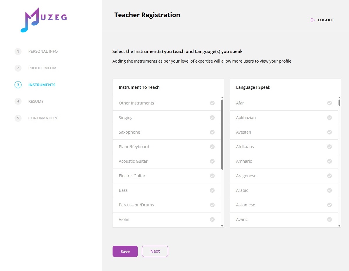 In this step, choose the instrument(s) you teach and the language(s) you speak. This helps Muzeg match you with the right students and makes your profile easier to find in search results.