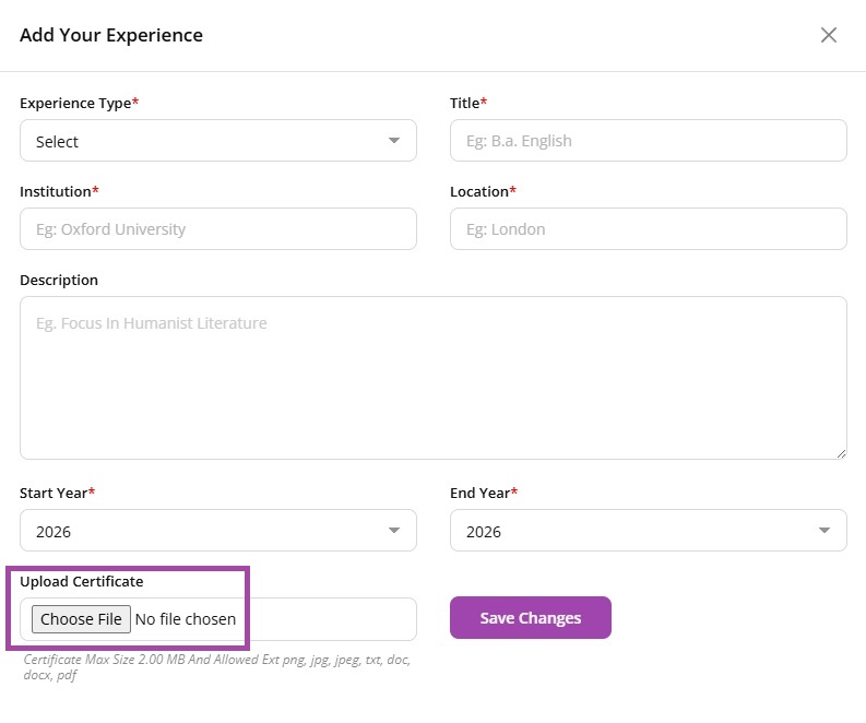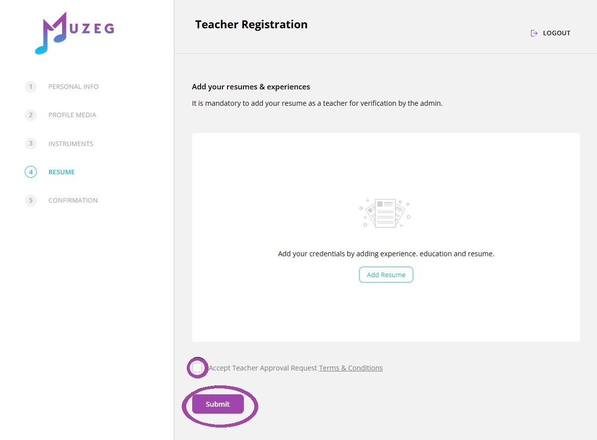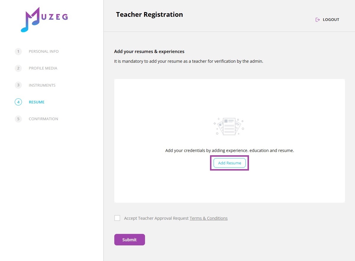 In this step, you’ll add your resume and credentials for verification. This is mandatory so the admin can review your background and approve your teacher account.